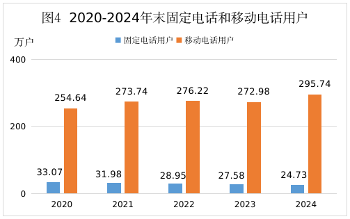 全年完成邮电业务总量39.82亿元,比上年增长15.1%。其中,邮政业务总量11.50亿元,增长23.5%;电信业务总量28.31亿元,增长12.0%。年末电话总用户320.47万户,比上年末增长6.6%;其中,固定电话用户24.73万户,移动电话用户295.74万户。年末5G移动电话用户202.45万户,比上年末增加44万户;年末4G移动电话用户211.22万户,比上年末增加0.36万户。年末(固定)互联网宽带接入用户95.46万户,比上年末增加2.55万户。年末移动互联网用户270.11万户,增长5.7%。