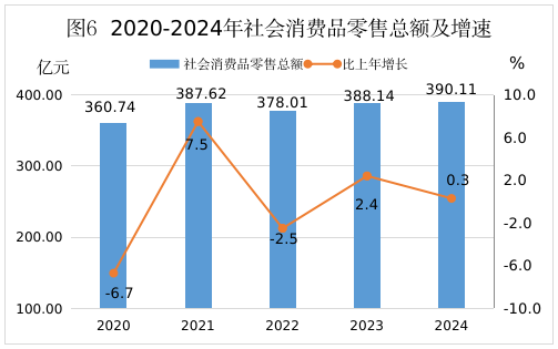 全年社会消费品零售总额390.11亿元,比上年增长0.3%。按经营地统计,城镇消费品零售额297.88亿元,增长0.1%;乡村消费品零售额92.23亿元,增长0.5%。从消费类型看,商品零售357.28亿元,下降0.1%;餐饮收入32.83亿元,增长3.2%。