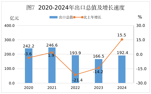 全年货物进出口总值230.5亿元,比上年增长10.1%。其中,出口总值192.4亿元,增长15.5%;进口总值38.2亿元,下降11.2%。