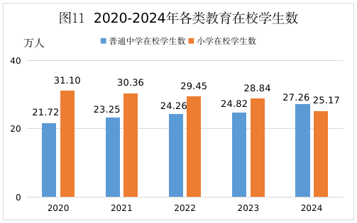 全市共有幼儿园534所,在园幼儿8.71万人;学前教育幼儿毛入园率为98.93%,比上年提高0.22个百分点;小学323所,普通中学202所,其中,初级中学110所,高级中学18所,完全中学12所,一贯制学校62所(九年一贯制学校56所,十二年一贯制学校6所);小学在校学生27.26万人,学龄人口入学率达100%;初中在校学生16.11万人,初中学龄人口入学率100%;高中在校学生9.06万人,比上年增加0.52万人,高中阶段教育毛入学率97.67%,提高0.07个百分点。本市各类中等职业教育学校15所,在校生3.9万人;技工学校3所,在校生1.05万人。普通高等教育院校2所,在校生2.02万人。