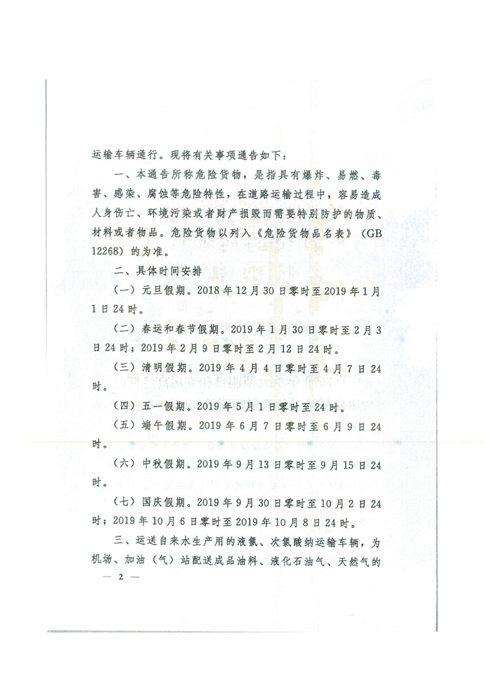 关于2019年重大节假日和春运高峰期间高速公路禁止危险货物运输车辆通行的通告