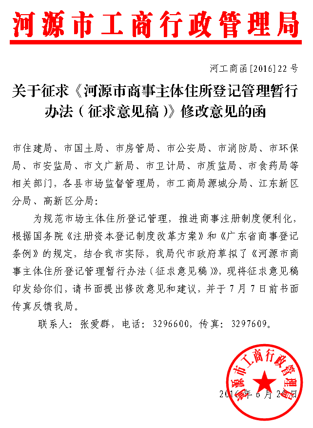 关于征求《河源市商事主体住所登记管理暂行办法(征求意见稿)》修改意见的函