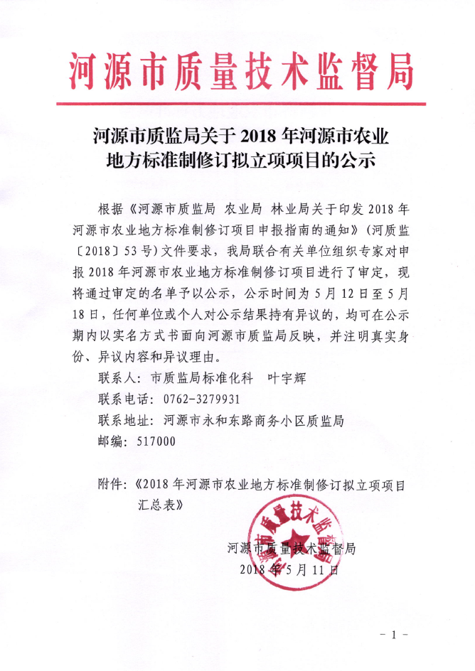 河源市质监局关于2018年河源市农业地方标准制定修订拟立项项目的公示