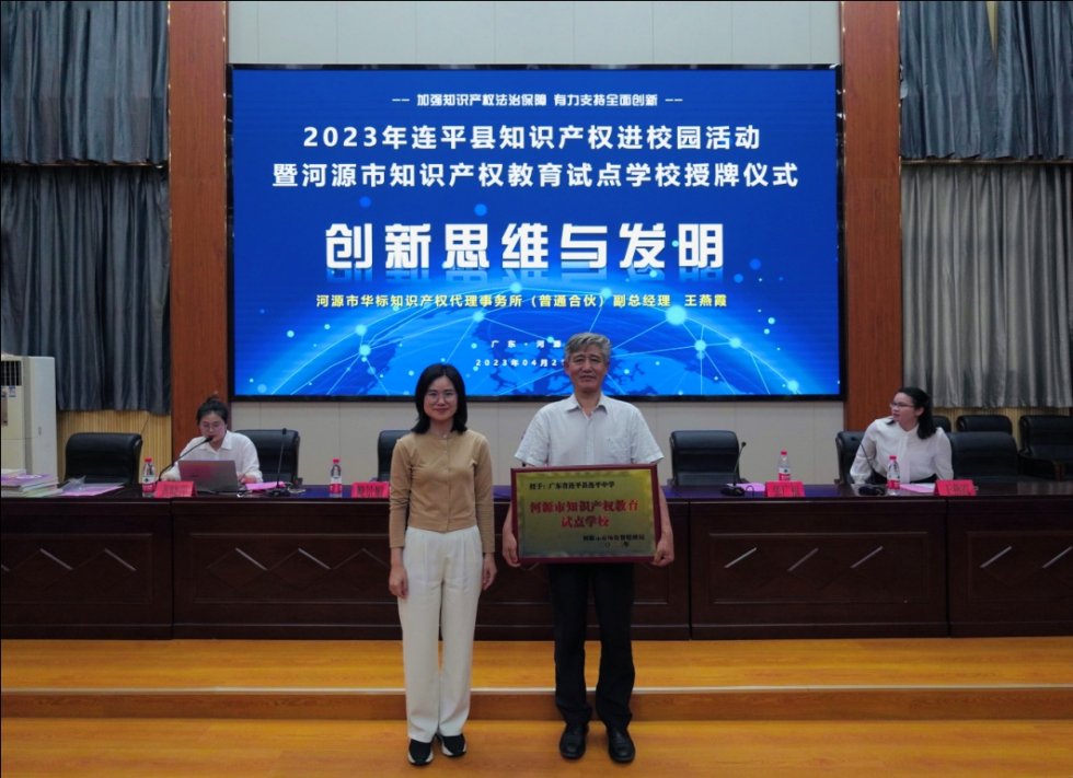 连平县市场监管局分别在连平县第一小学及连平县连平中学开展2023年连平县知识产权进校园活动暨河源市知识产权教育试点示范学校授牌仪式,同时开展了专题讲座、有奖问答、赠送书籍等活动,让参与活动的学生进一步了解知识产权的概念、类型和作用,指导他们如何进行知识产权发明、创造、创新等,营造了浓厚的知识产权教育和激励创新氛围