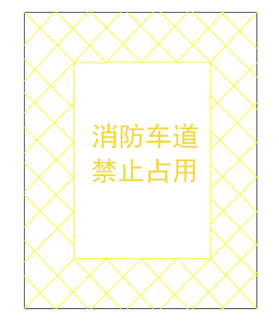在单位或者住宅区的消防车通道出入口路面,按照消防车通道净宽施划禁停标线,标线为黄色网状实线,外边框线宽20厘米,内部网格线宽10厘米,内部网格线与外边框夹角45度,标线中央位置沿行车方向标注内容为“消防车道禁止占用”的警示字样(示例见图2);同时在消防车通道两侧设置醒目的警示标牌(示例见图3),提示严禁占用消防车道,违者将承担相应法律责任等内容。