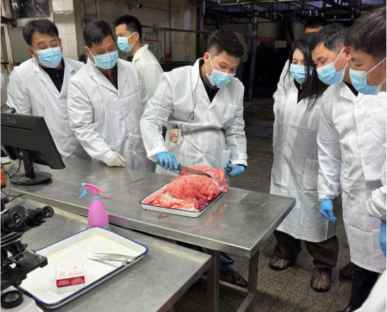 同时,培训班还结合检疫工作实操的特殊性,连续3晚安排在屠宰场进行现场实操教学,两位老师根据检疫流程开展现场示范指导,针对每个环节逐项开展现场教学、现场示范,并指导学员们分组实操训练,确保每个学员能够独立完成一整套检疫流程。通过培训,进一步锻炼了我市动物检疫人员的操作能力,提升了动物检疫规范化水平,为推动百亿级生态畜禽产业发展提供了强有力的技术支撑。