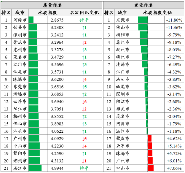 城市排名:基于270个省考断面水质监测结果,按照城市水质指数由低到高排名,全省水环境质量前三名为河源、韶关和深圳市,后三名由高到低为湛江、潮州和揭阳市。东莞、佛山和揭阳等16市水环境质量同比有所改善,中山、广州和珠海等5市同比有所下降。