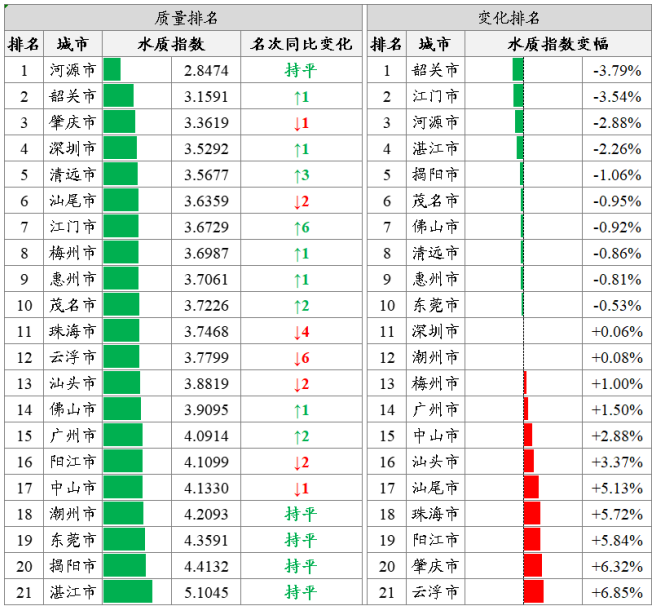 城市排名:基于270个省考断面水质监测结果,按照城市水质指数由低到高排名,全省水环境质量前三名为河源、韶关和肇庆市,后三名由高到低为湛江、揭阳和东莞市。韶关、江门和河源等10市水环境质量同比有所改善,云浮、肇庆和阳江等11市同比有所下降。