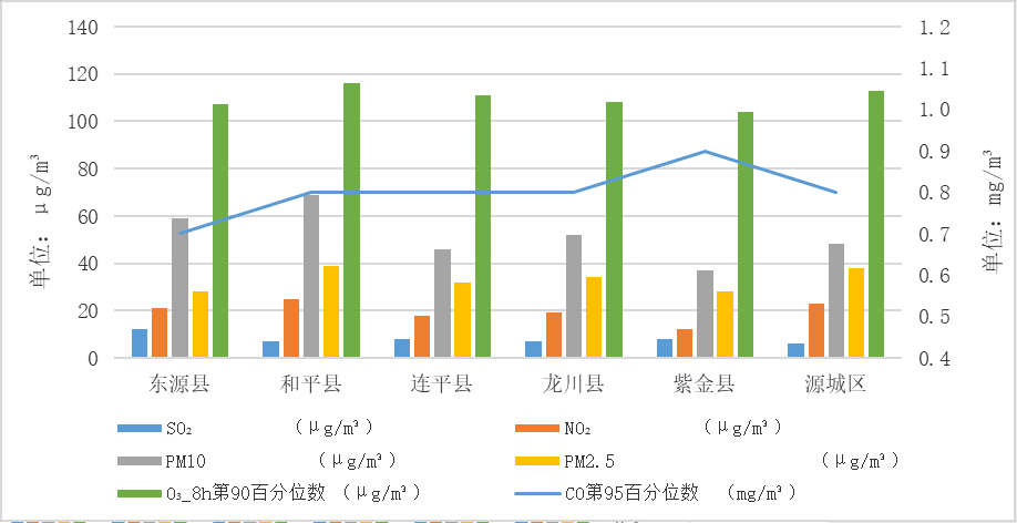 各县区各项污染物浓度指标均符合《环境空气质量标准》(GB3095-2012)年均浓度二级标准限值要求,按照环境空气质量综合指数排名,第一名为紫金县,第二名为连平县,第三名为龙川县(详见表1、图1)。