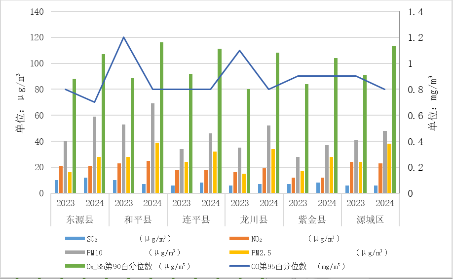 根据国家对河源市环境空气考核的情况,2024年12月我市环境空气质量综合指数为3.42,达标天数31,达标率为100%,其中优的天数为11天,良的天数为20天。空气首要污染物为PM2.5和O3-8h。我市SO2、NO2、PM10和PM2.5浓度均值分别为6μg/m3、23μg/m3、50μg/m3和39μg/m3,CO日均浓度第95百分位数为0.8mg/m3,O3日最大8小时浓度第90百分位数为115μg/m3,除PM2.5外均符合《环境空气质量标准》(GB3095-2012)二级标准限值要求。