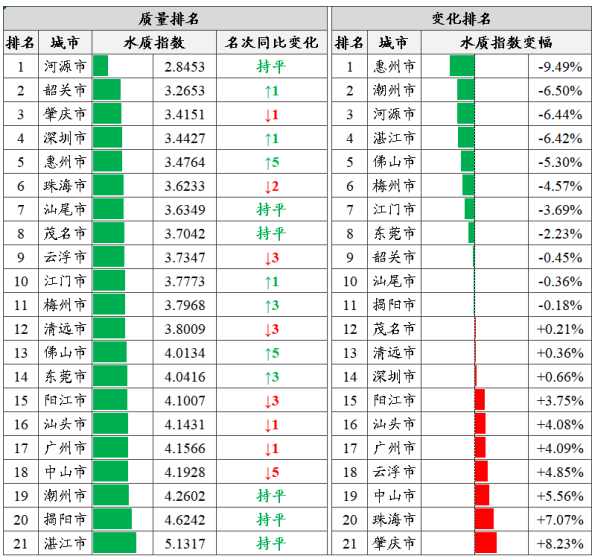 城市排名:基于270个省考断面水质监测结果,按照城市水质指数由低到高排名,全省水环境质量前三名为河源、韶关和肇庆市,后三名由高到低为湛江、揭阳和潮州市。惠州、潮州和河源等11市水环境质量同比有所改善,肇庆、珠海和中山等10市同比有所下降。