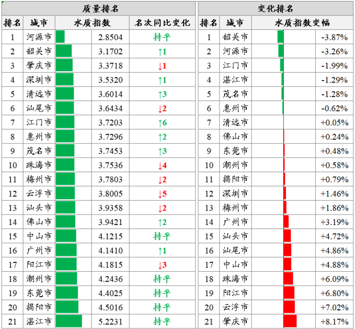 城市排名:基于270个省考断面水质监测结果,按照城市水质指数由低到高排名,全省水环境质量前三名为河源、韶关和肇庆市,后三名由高到低为湛江、揭阳和东莞市。韶关、河源和江门等6市水环境质量同比有所改善,肇庆、云浮和阳江等15市同比有所下降。