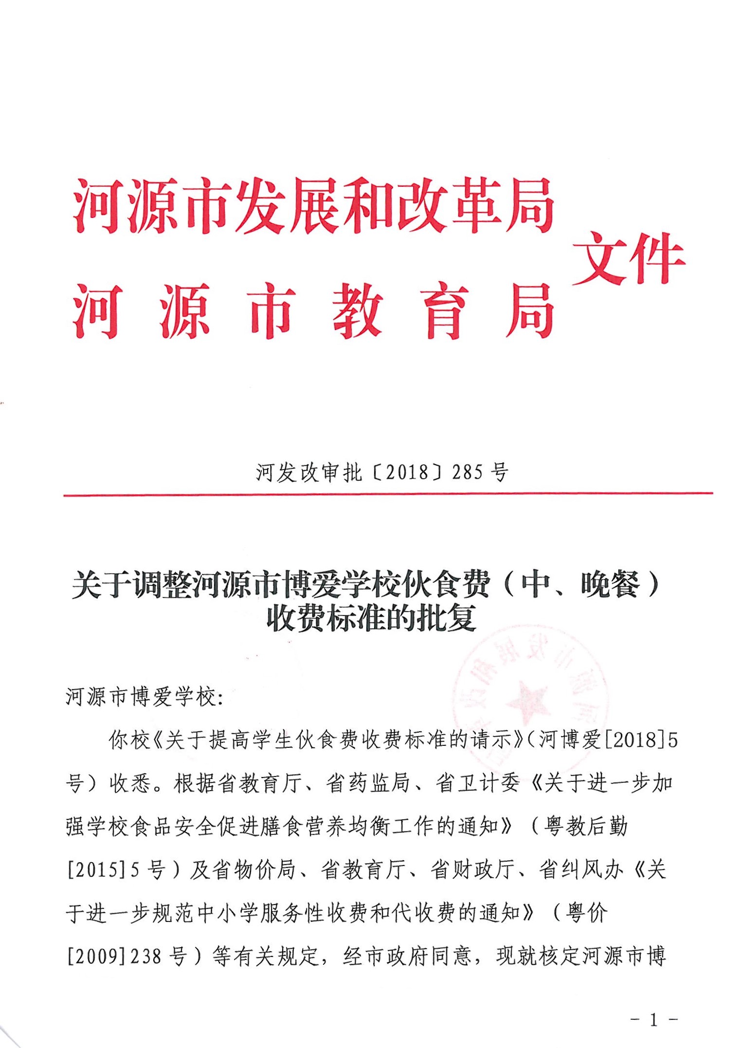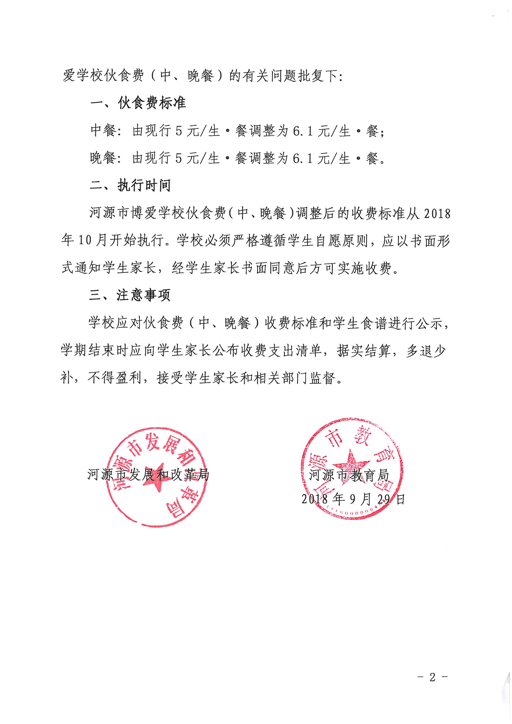 河源市发展和改革局关于调整河源市博爱学校伙食费(中晚餐)收费标准的批复