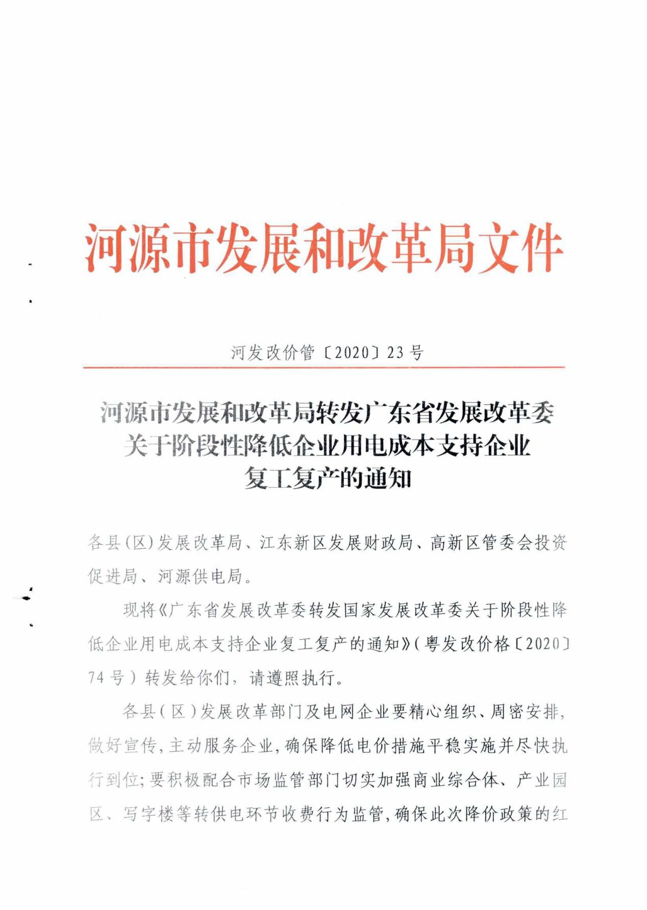 河源市发展和改革局转发广东省发展改革委关于阶段性降低企业用电成本支持企业复工复产的通知