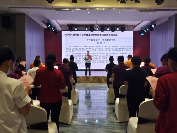 培训结束后,参会的餐饮从业人员宣读了倡议书,许下“关注饮食安全共创餐桌文明”承诺,表示将充分发挥各类型餐饮服务业态在群众性精神文明创建活动中的示范带动作用,引领形成文明用餐、节俭用餐、安全用餐、卫生用餐的就餐新风尚。