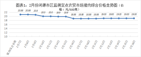 一、肉类价格微涨。2月天气寒冷又逢节假日,肉类需求量增加,总体价格微涨,中下旬后价格逐渐回落。市区八个畜类品种月均综合价格35.25元(每500克,下同),环比微涨0.97%。猪肉市场零售月均综合价格19.55元,环比涨1.19%。零售价格涨跌互现(图表1):排骨26.16元、有皮上肉16.19元,环比涨7.39%、0.31%;精瘦肉19.38元、肋条肉16.47元、环比分别降1.67%、3.4%;牛肉54.16元、牛肉(腱子肉)60.31元、牛腩45.16元、羊肉44.19元,环比分别涨0.3%、0.52%、0.36%、2.65%。