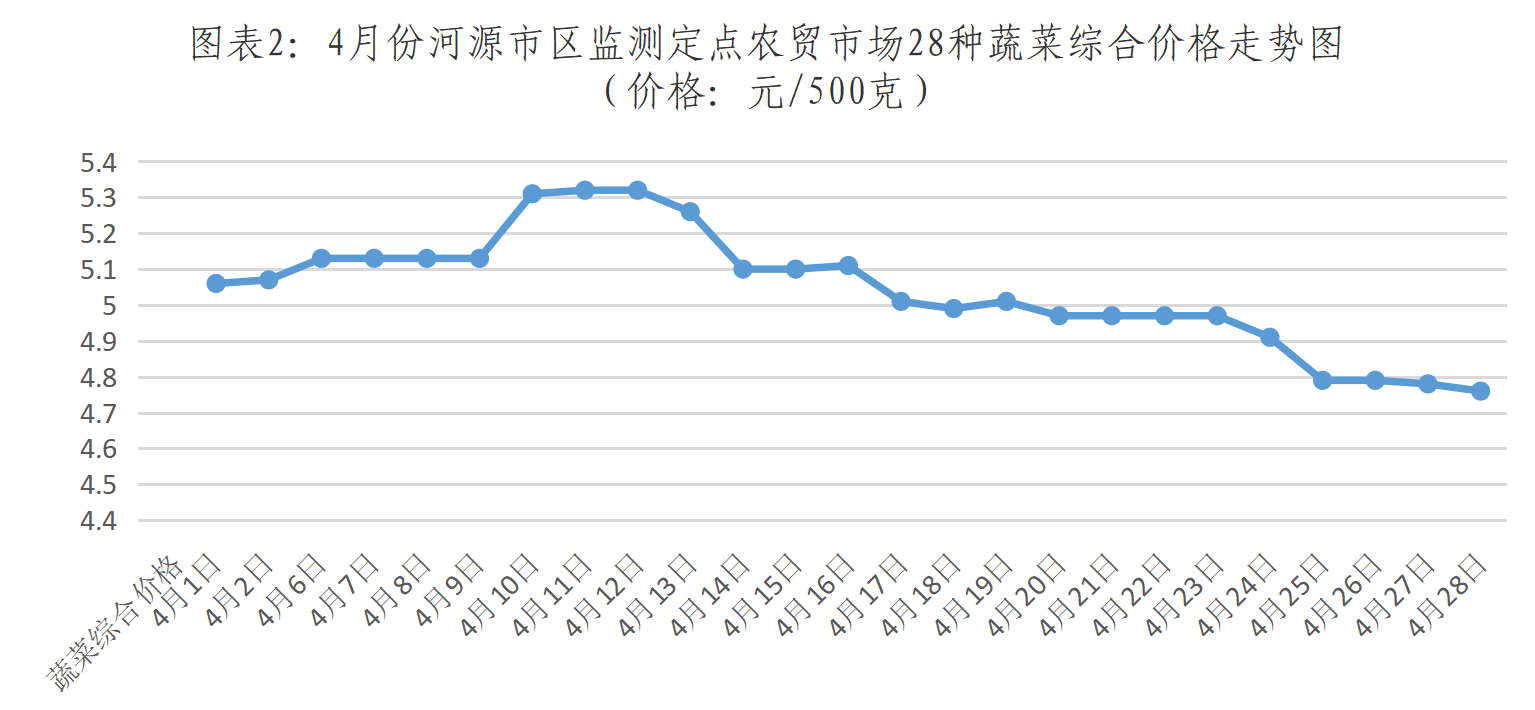 二、蔬菜价格本月呈现先涨后跌态势。市区监测的28种蔬菜月均综合价格5.04元(本月奶白菜无数据)与上月29种蔬菜环比涨5.22%,本月综合价格总体呈下跌态势(图表2)。与上月比涨幅较大的蔬菜品种有:水东芥菜4.33元、芥兰5.65元、西芹5.11元、菠菜5.89元、青皮冬瓜3.4元,环比分别涨17.98%、12.33%、10.61%、15.94%、16.44%。