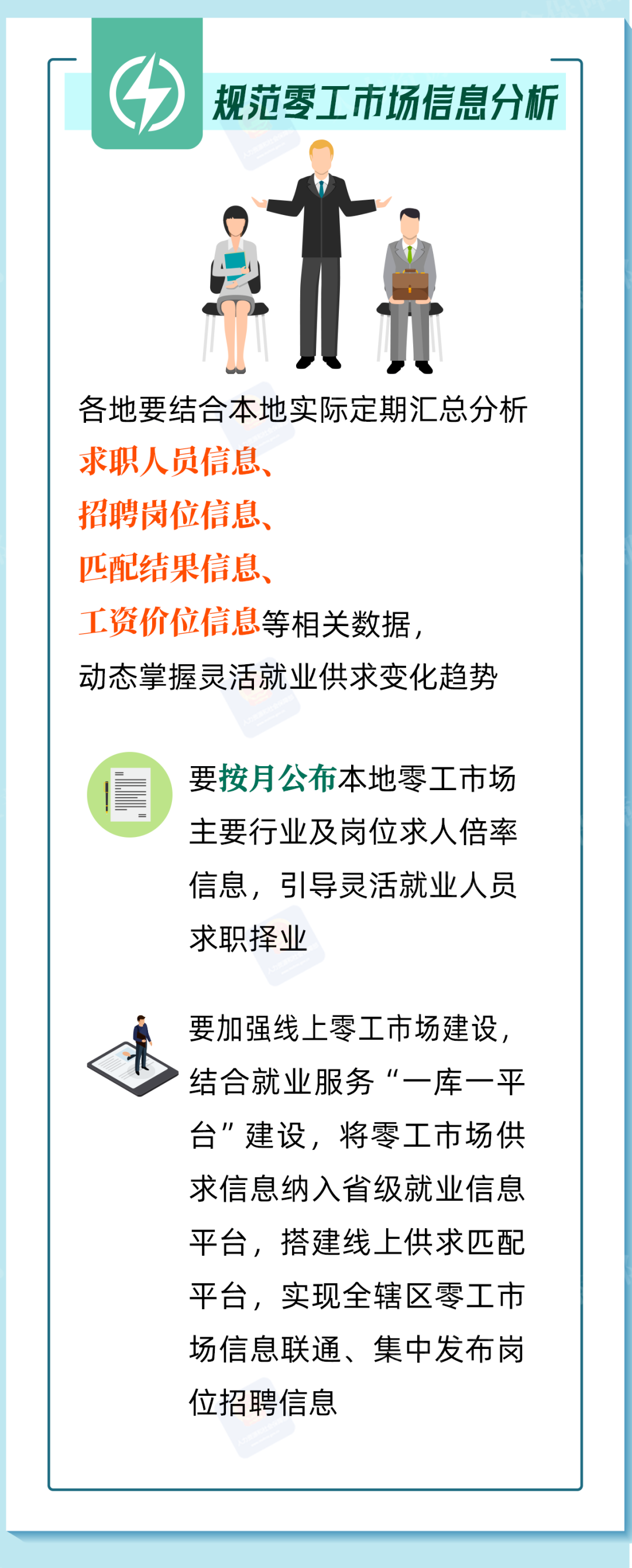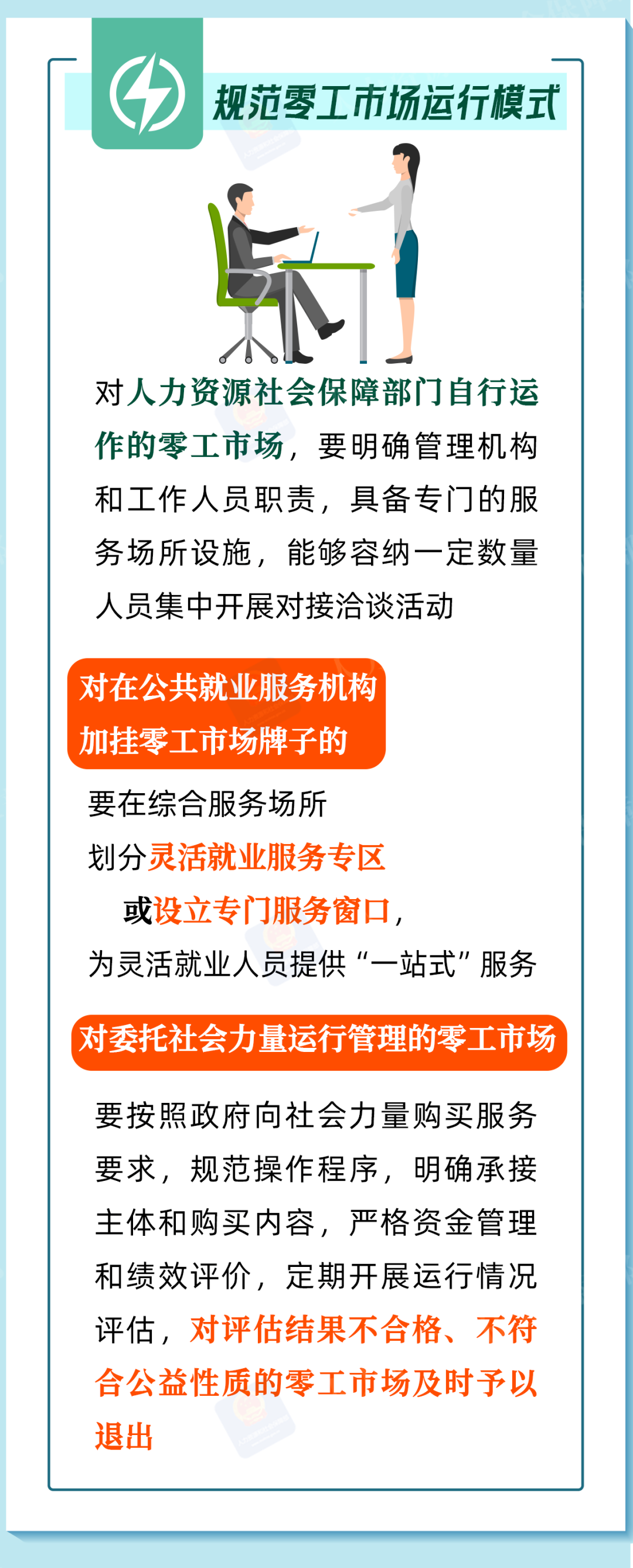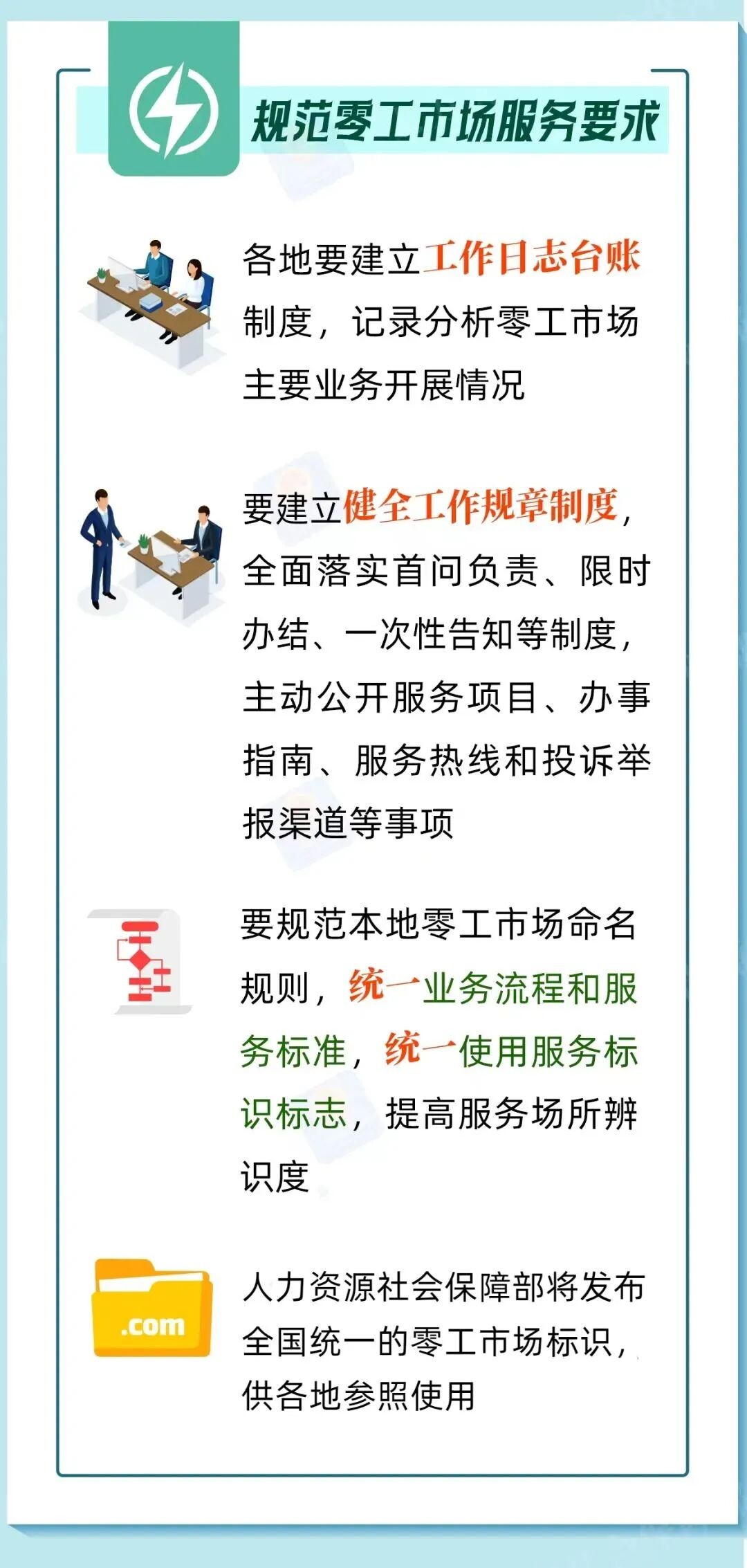 零工市场是向灵活就业人员与用工主体提供就业服务的重要载体。人力资源社会保障部印发《关于加强零工市场规范化建设的通知》,将零工市场纳入就业公共服务体系建设工作,带您一图看懂。