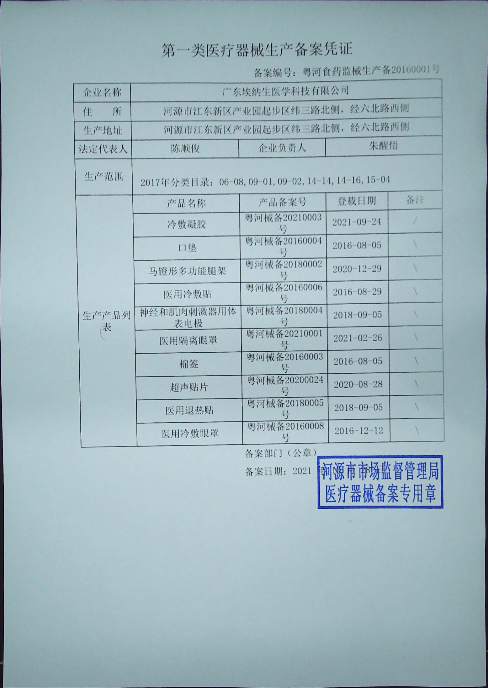 根据《医疗器械监督管理条例》、《医疗器械注册与备案管理办法》等有关规定,现将广东埃纳生医学科技有限公司第一类医疗器械生产备案变更信息予以公告。