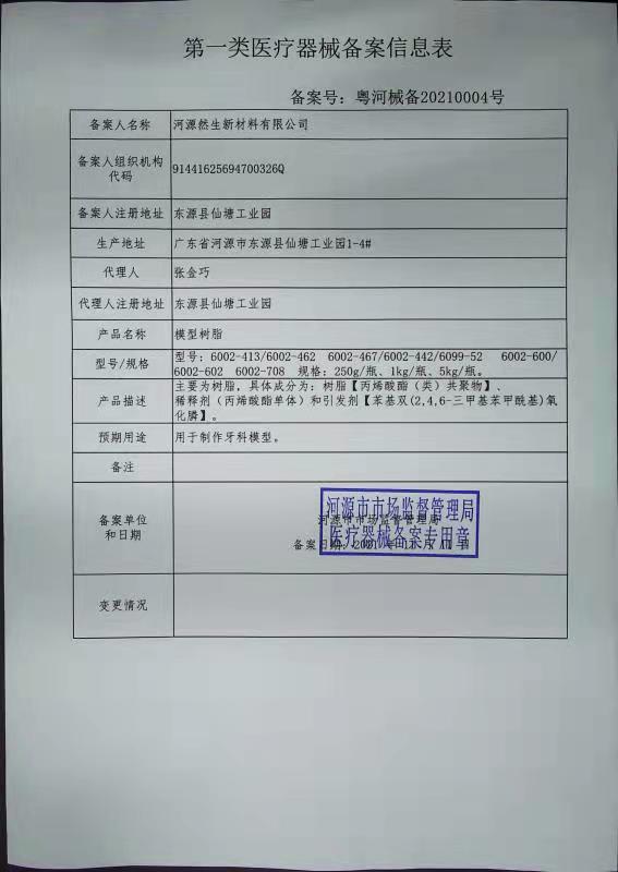 根据《医疗器械监督管理条例》、《医疗器械注册与备案管理办法》等有关规定,现将“模型树脂”1个第一类医疗器械产品备案(或者变更备案)信息予以公告。