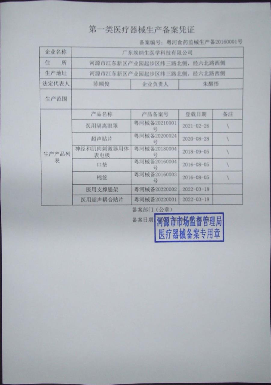 根据《医疗器械监督管理条例》、《医疗器械生产监督管理办法》等有关规定,现将“广东埃纳生医学科技有限公司”1个企业第一类医疗器械生产备案(变更)信息予以公告。