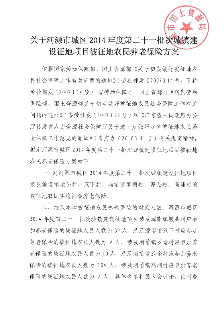 关于河源市城区2014年度第二十一批次城镇建设征地项目被征地农民养老保险方案