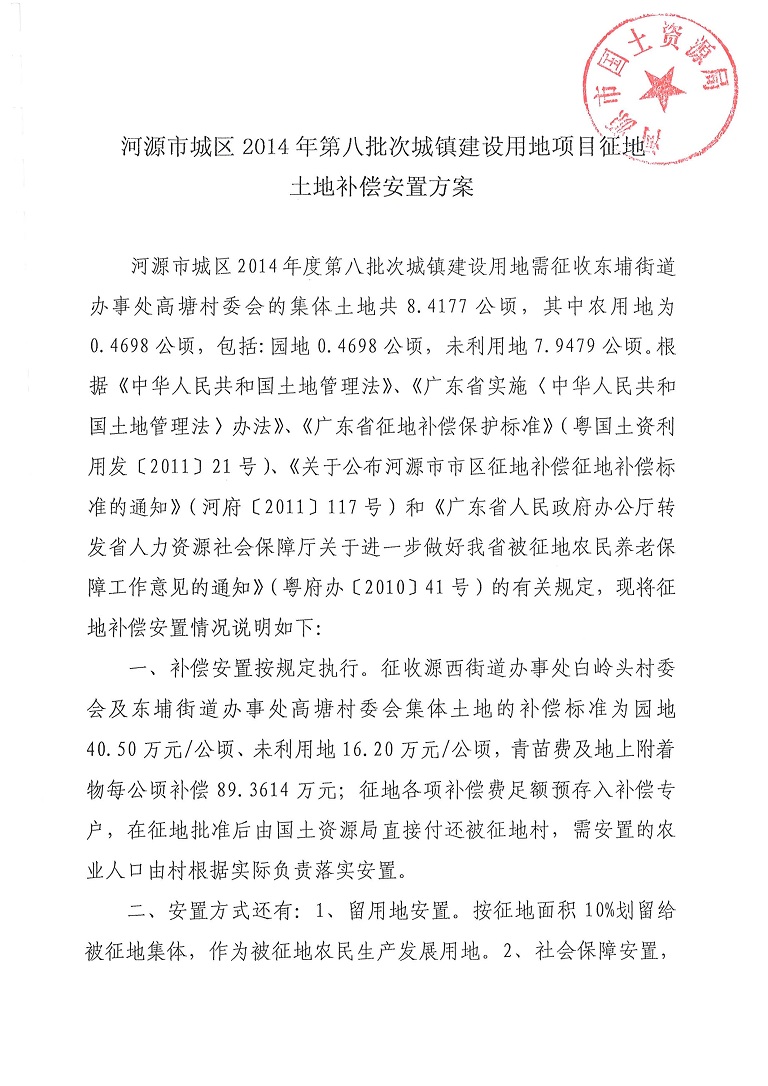 河源市城区2014年第八批次城镇建设用地项目征地土地补偿安置方案