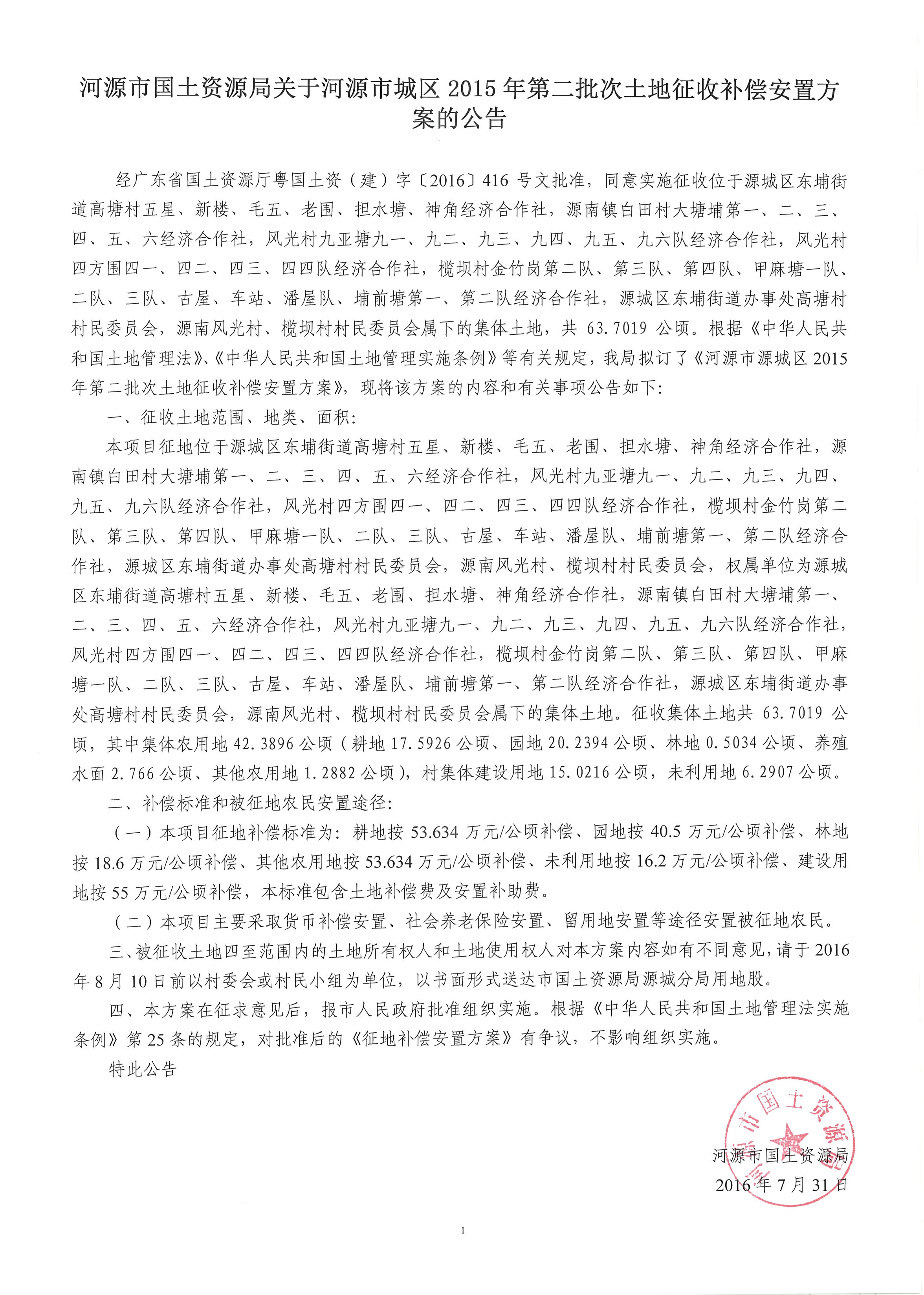98色花堂 关于河源市城区2015年第二批次土地征收补偿安置方案的公告