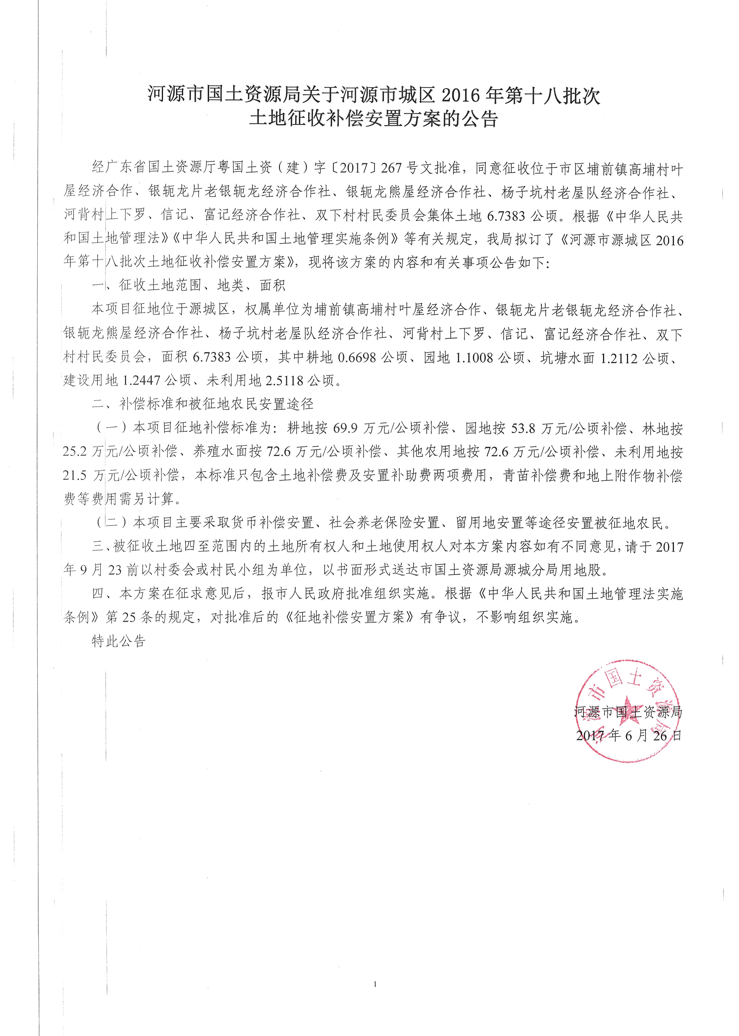 河源市国土资源局关于河源市城区2016年第十八批次土地征收补偿安置的公告