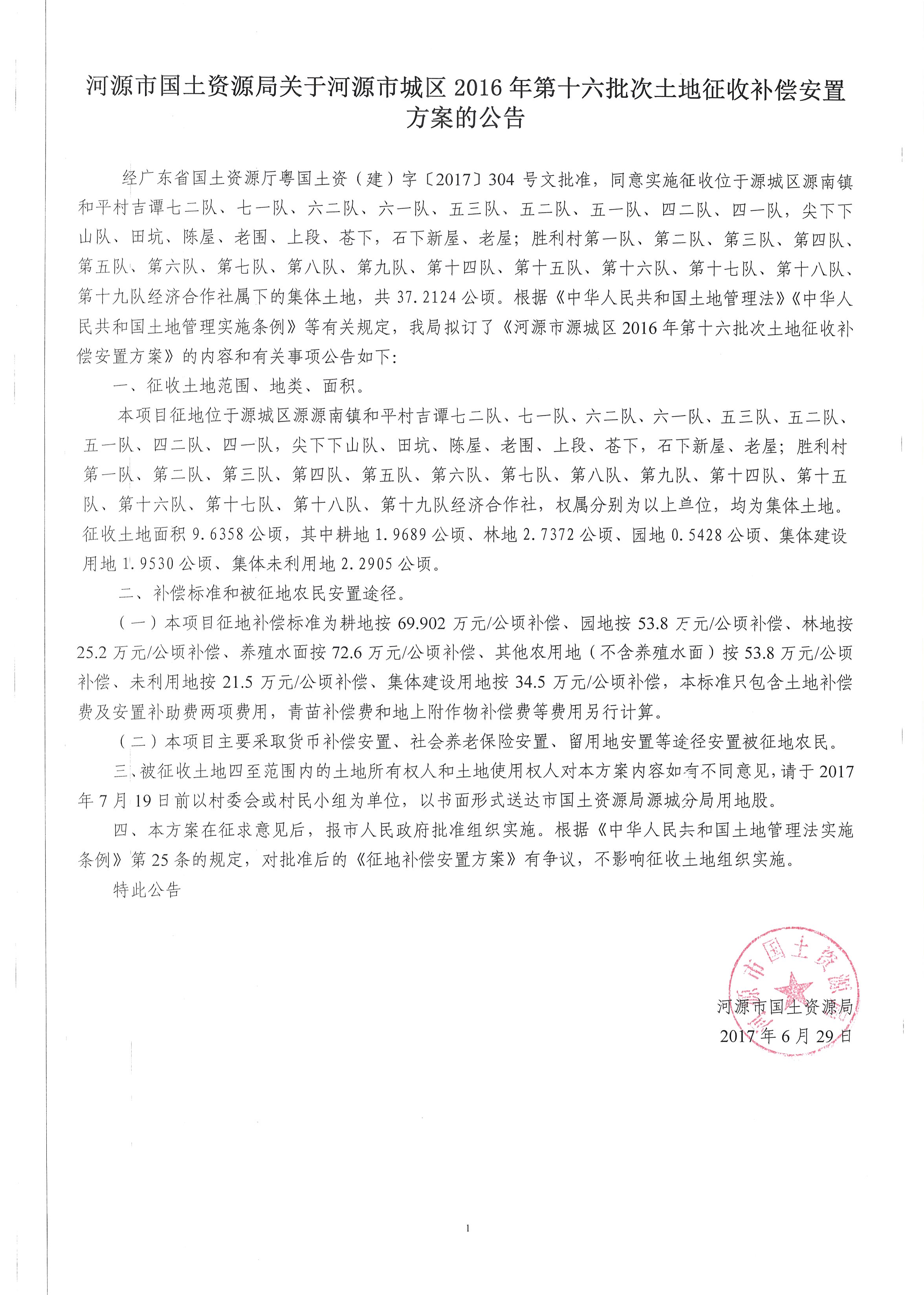 河源市国土资源局关于河源市城区2016年第十六批次土地征收补偿安置的公告