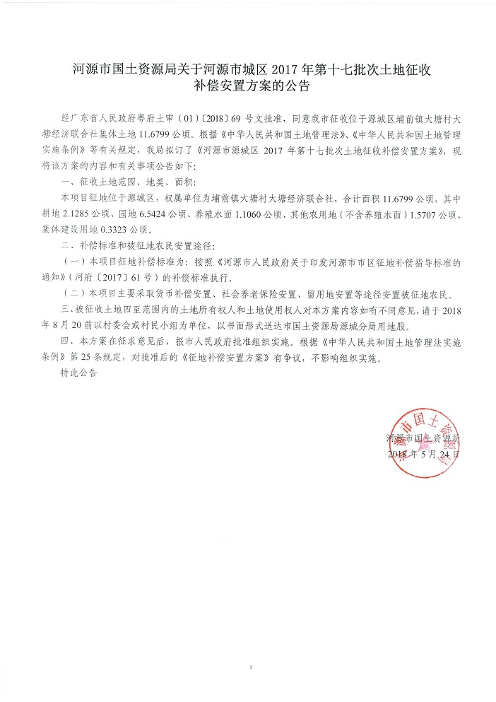 关于河源市城区2017年度第十七批城镇建设用地土地征收补偿安置公告