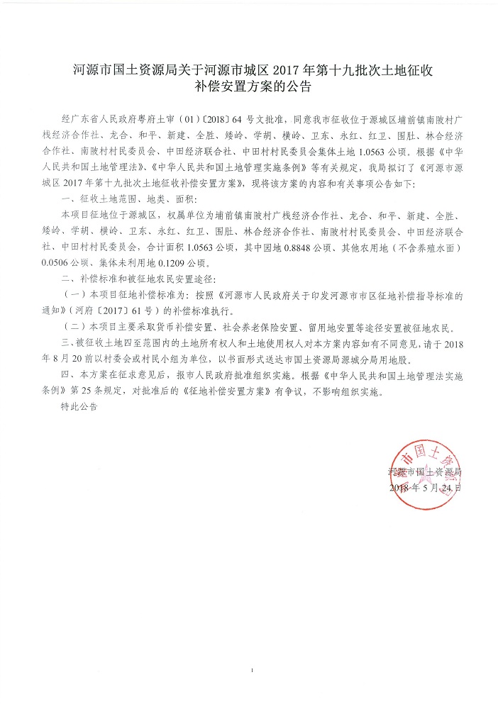 关于河源市城区2017年度第十九批城镇建设用地土地征收补偿安置公告