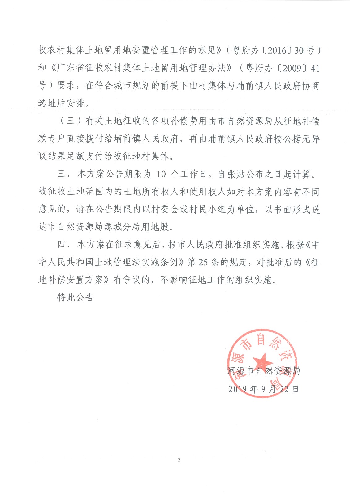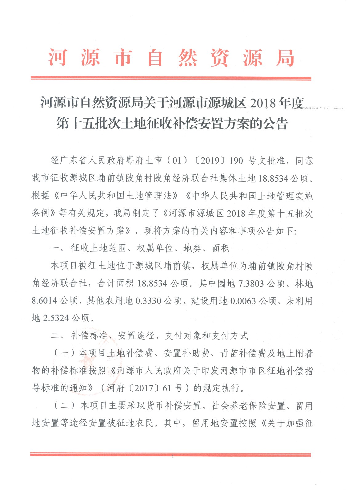 河源市自然资源局关于河源市源城区2018年度第十五批次土地征收补偿方案的公告