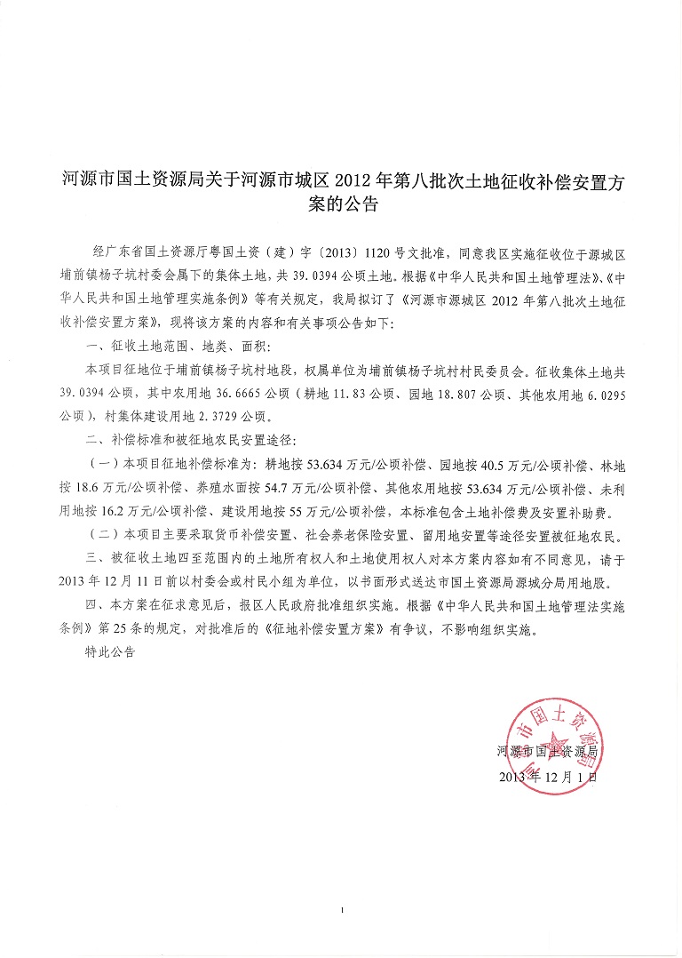 河源市国土资源局关于河源市城区2012年第八批次土地征收补偿安置方案的公告