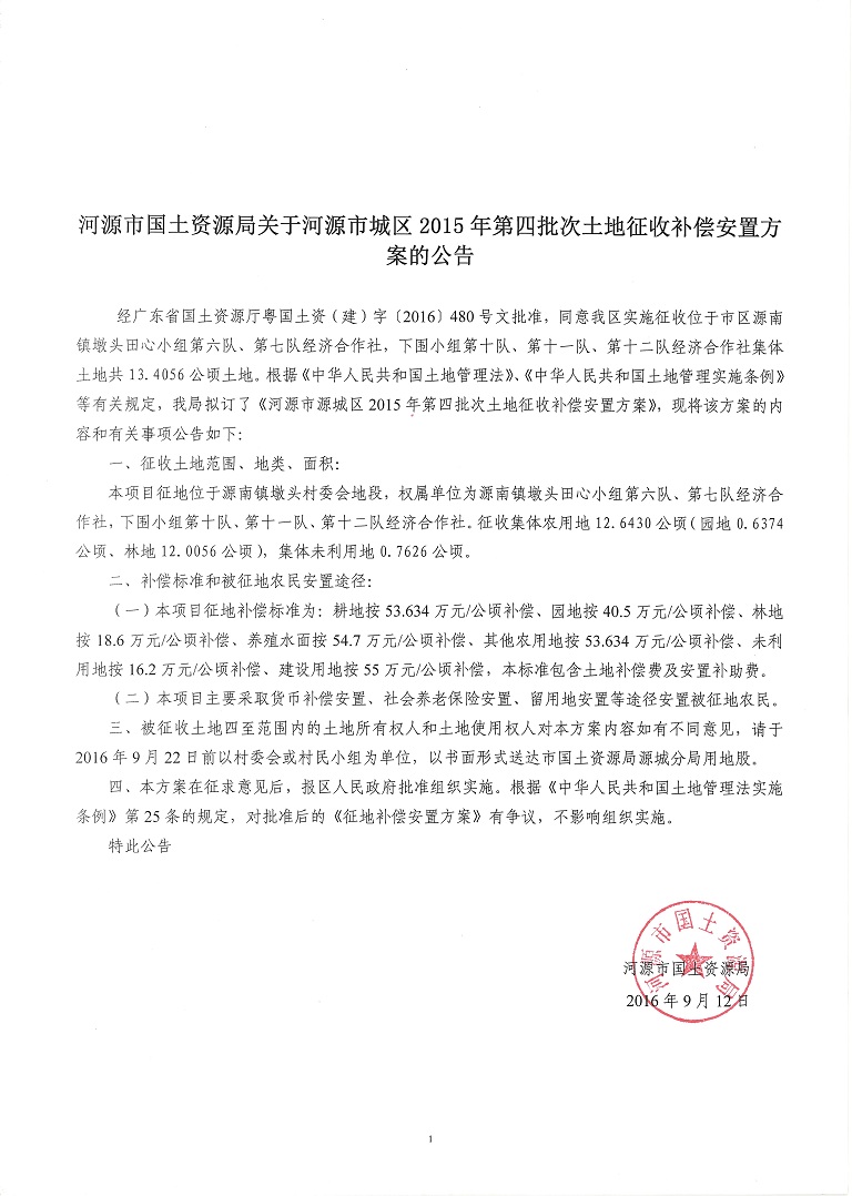 河源市国土资源局关于河源市城区2015年第四批次土地征收补偿安置方案的公告