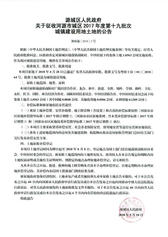 关于征收河源市城区2017年度第十九批城镇建设用地的公告