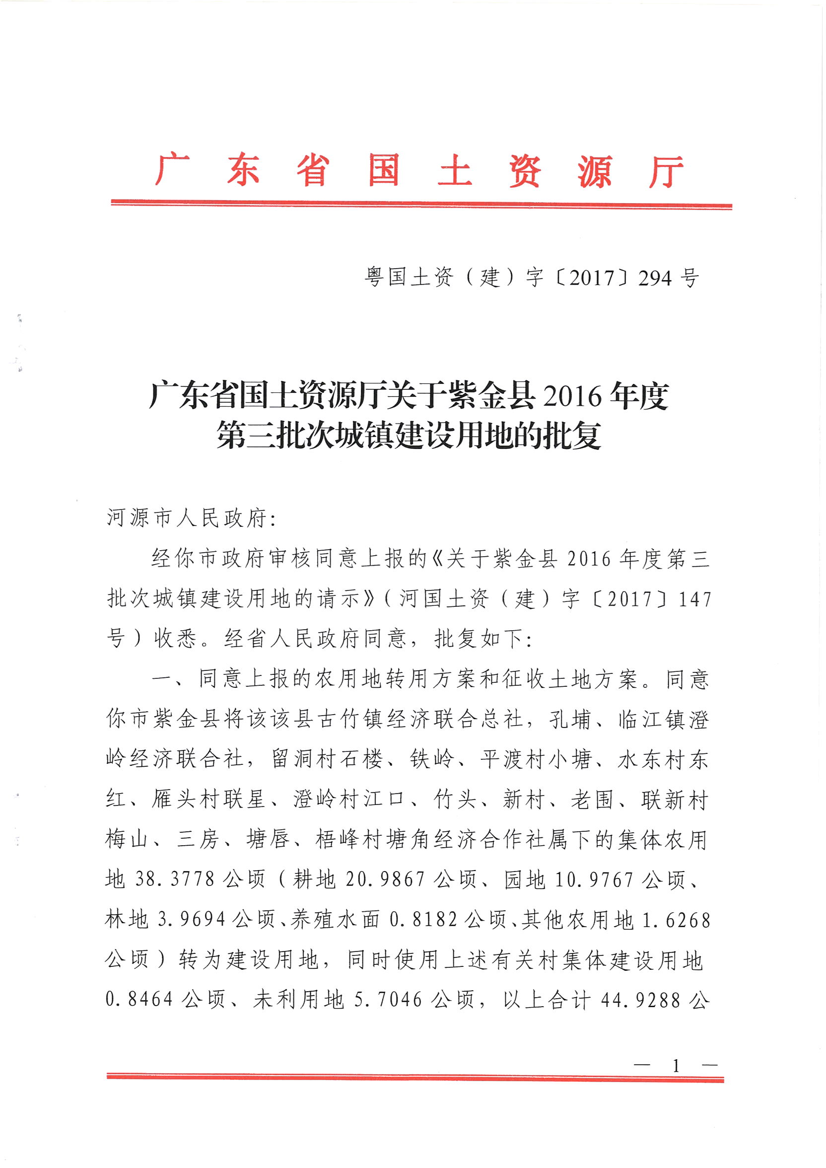 广东省国土资源厅关于紫金县2016年度第三批次城镇建设用地的批复