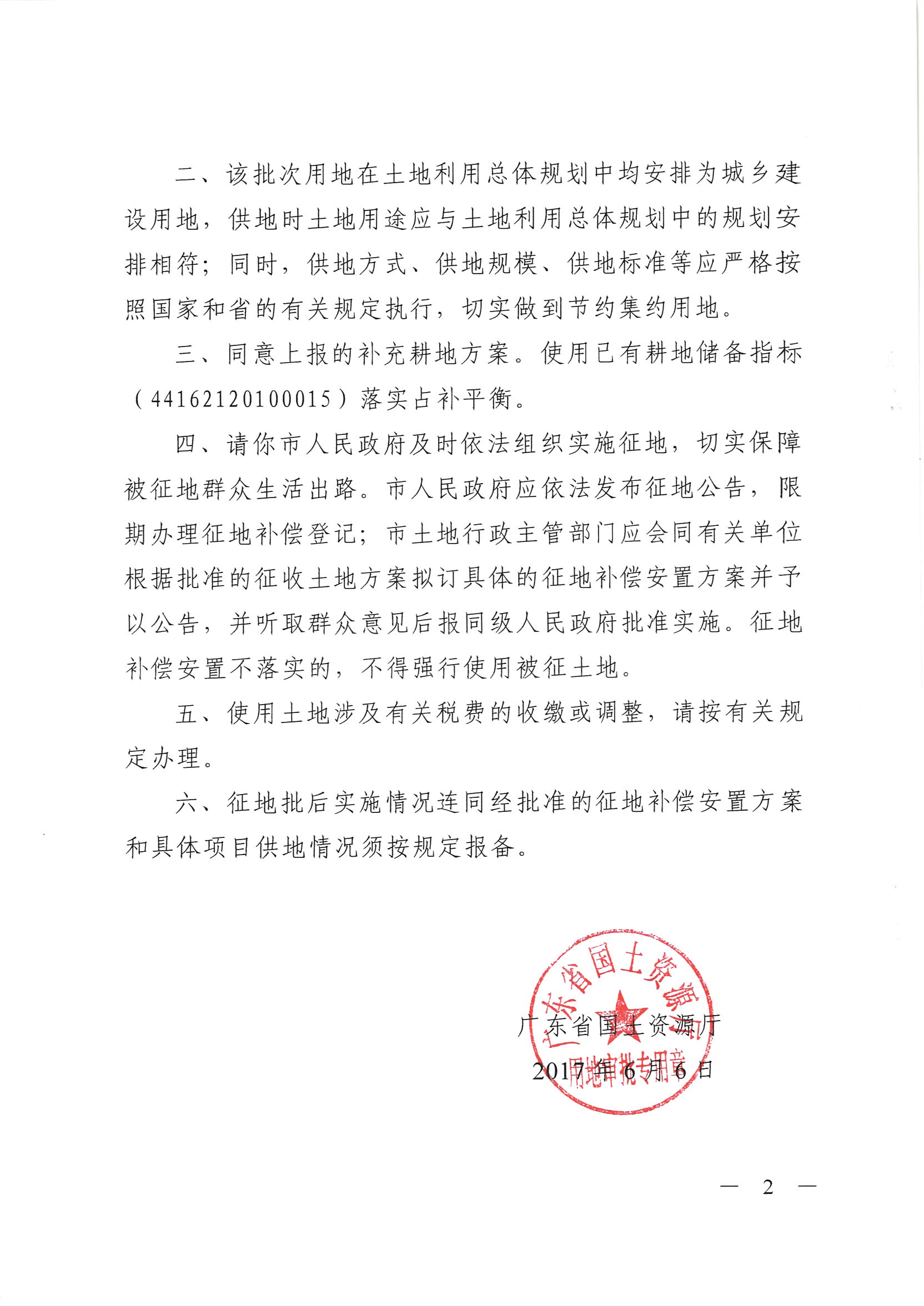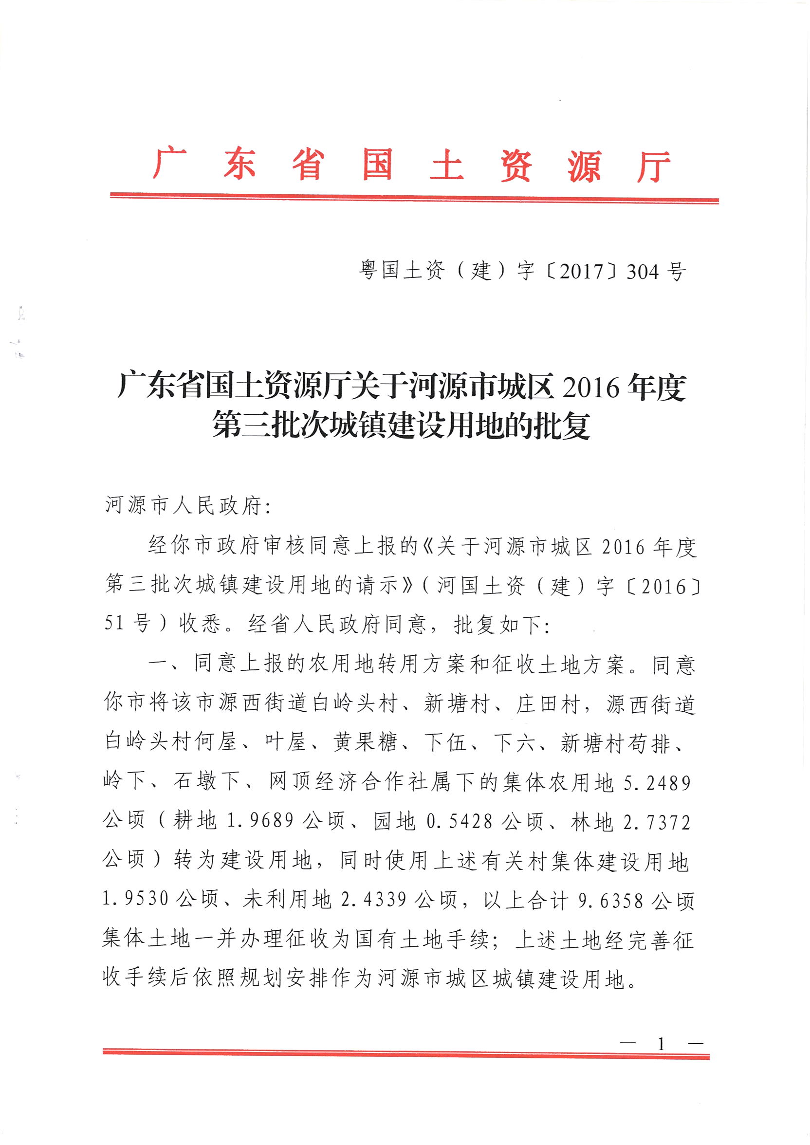 广东省国土资源厅关于河源市城区2016年度第三批次城镇建设用地的批复