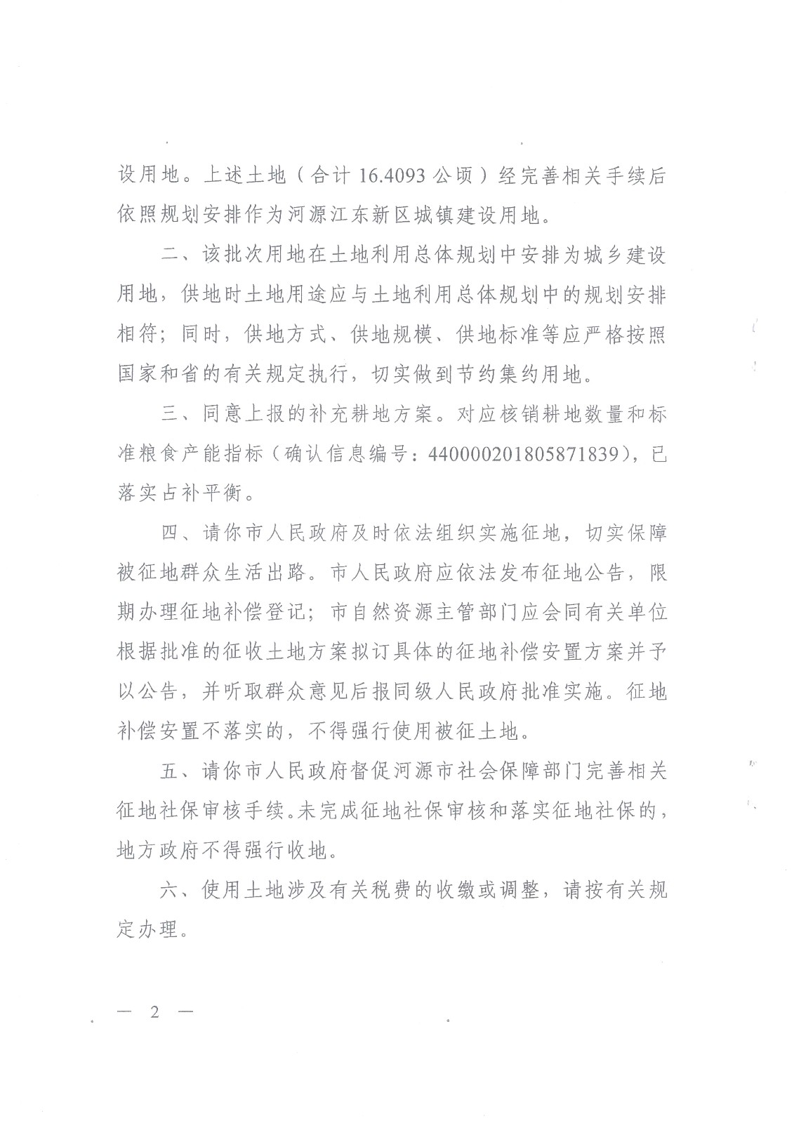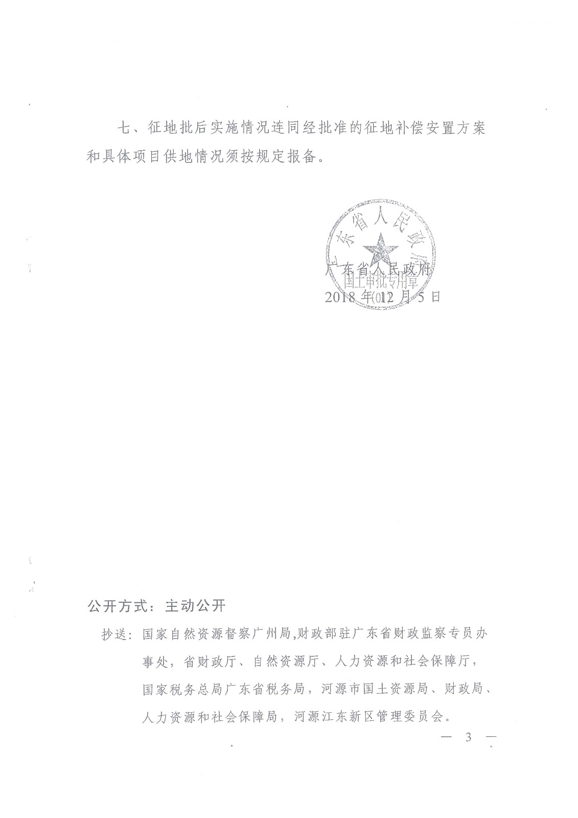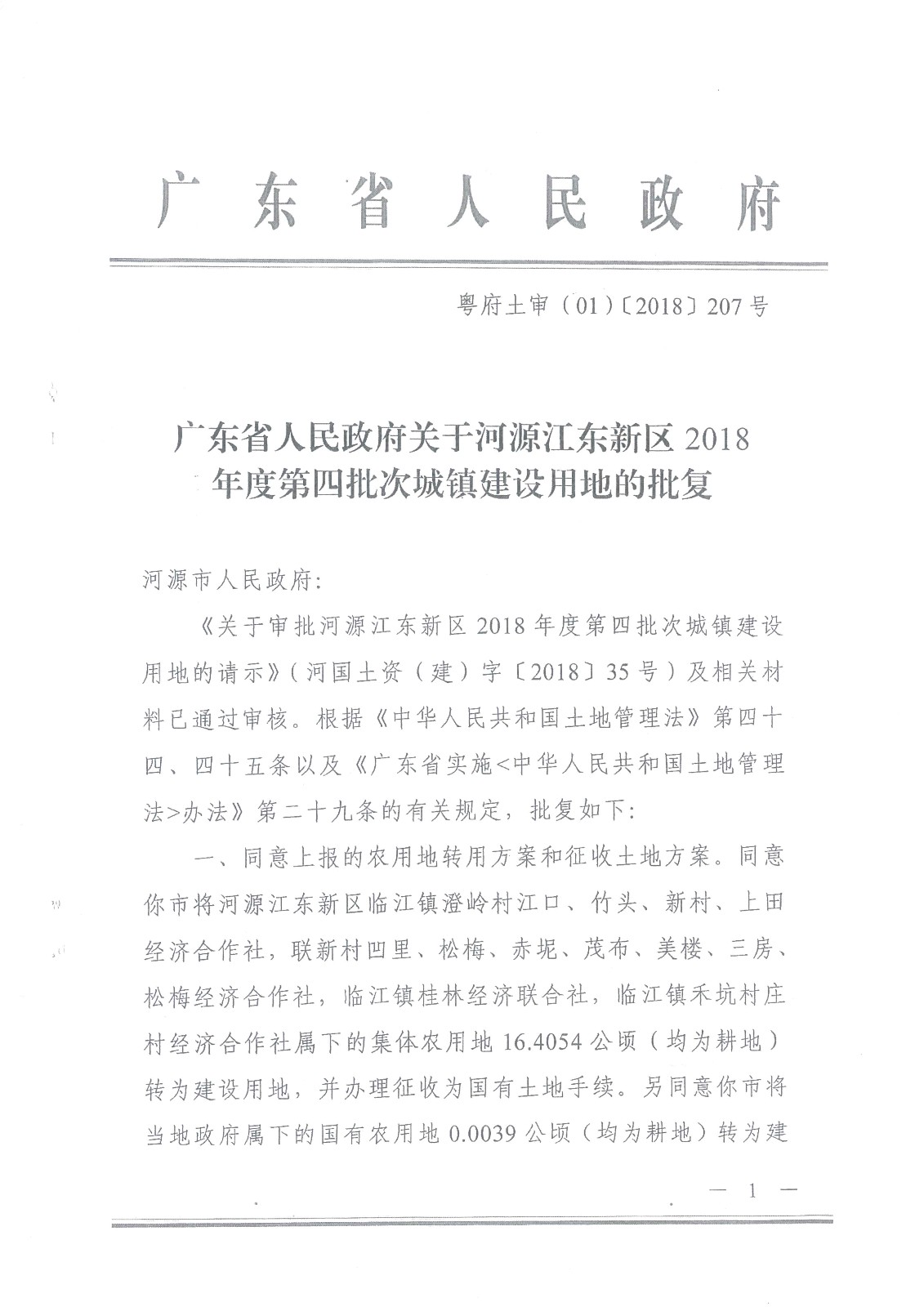 广东省人民政府关于河源东江新区2018年度第四批次城镇建设用地的批复