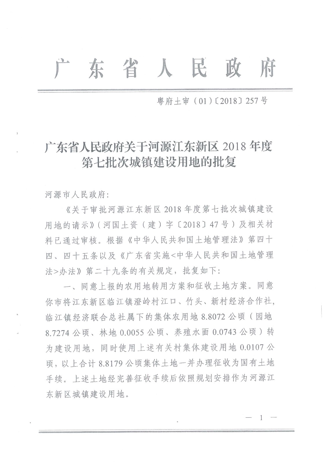 广东省人民政府关于河源东江新区2018年度第七批次城镇建设用地的批复