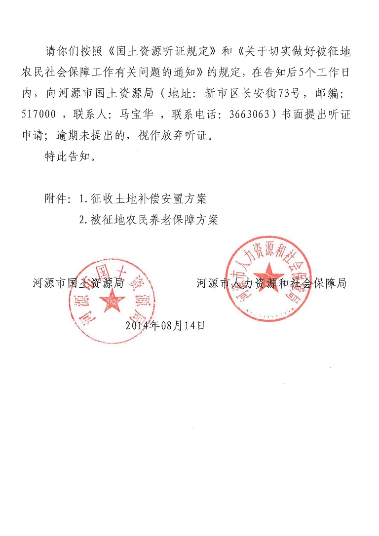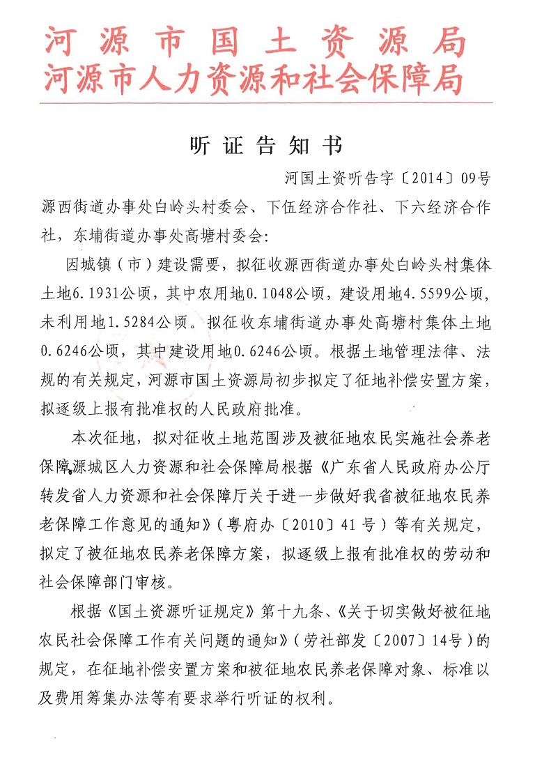 河源市城区2014年度第九批次城镇建设用地项目听证告知书