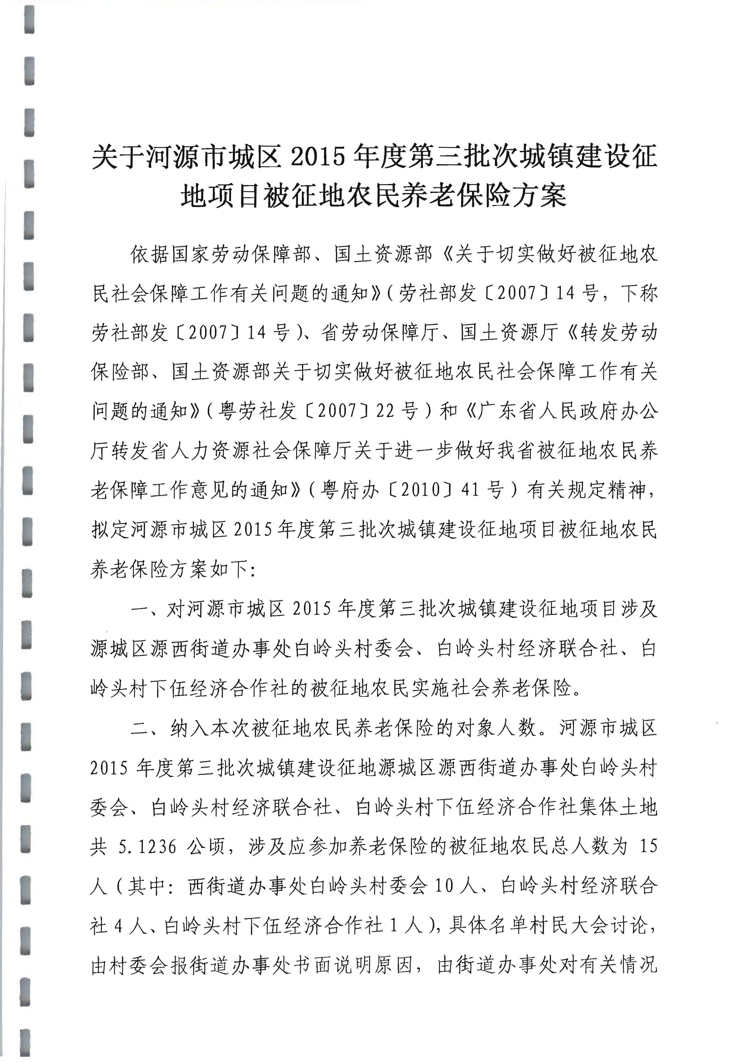 关于河源市城区2015年度第三批次城镇建设征地项目被征地农民养老保险方案