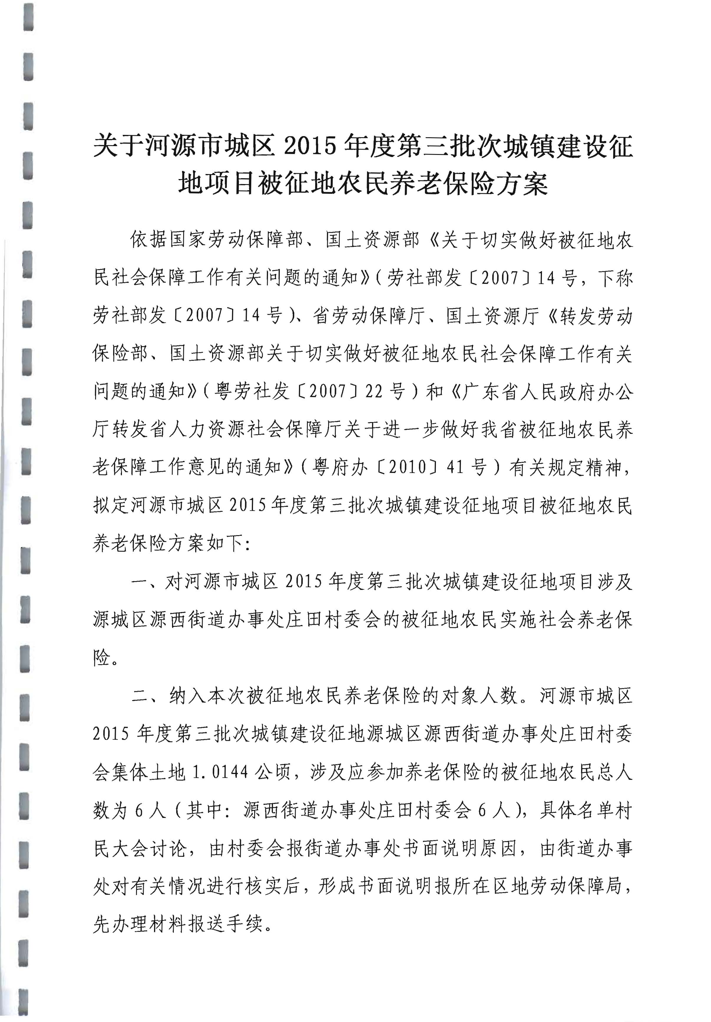 关于河源市城区2015年度第三批次城镇建设征地项目被征地农民养老保险方案