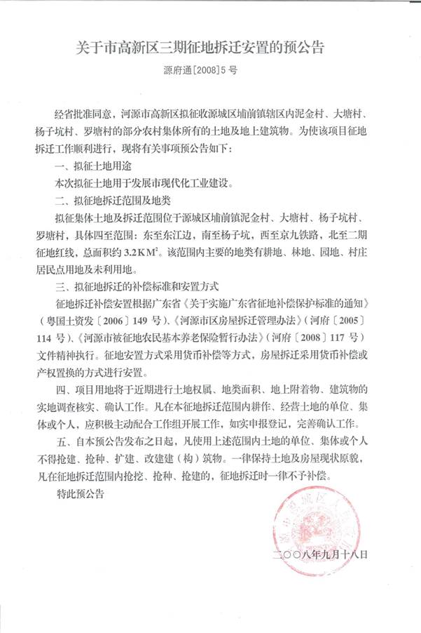 关于市高新区三期征地拆迁安置的预公告