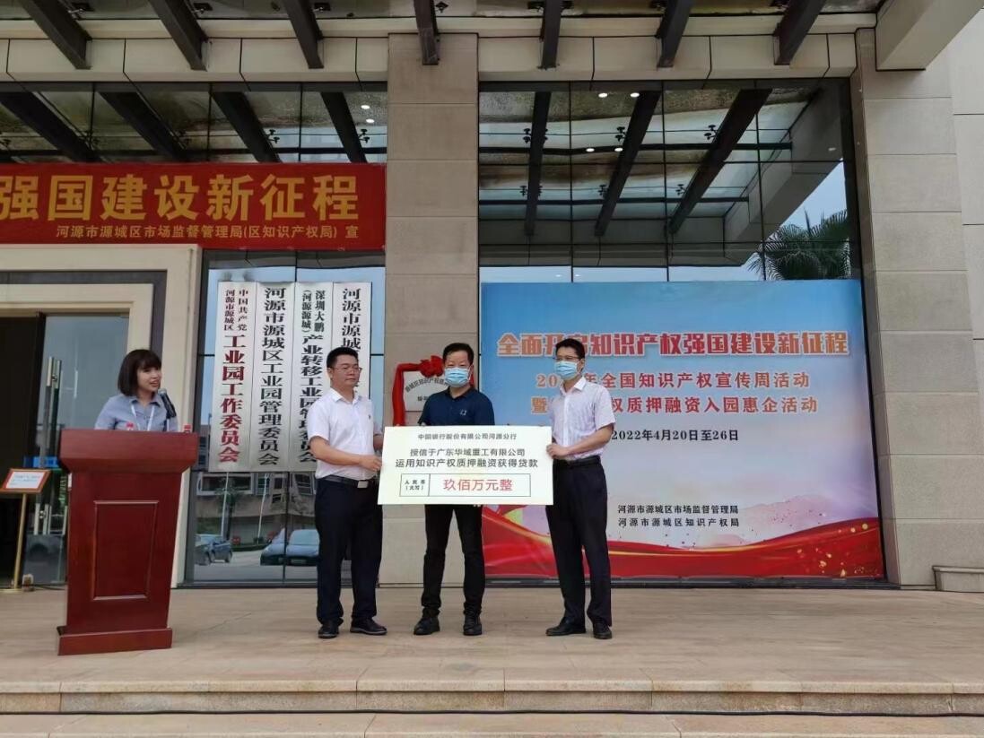 源城区市场监管局在龙岭工业园举办知识产权质押融资“入园惠企”活动暨知识产权质押融资服务工作站挂牌仪式,该工作站是河源市首个入园设站的知识产权质押融资服务工作站,服务工作站的设立将有利于更好地开展园区知识产权质押融资服务、政策解读、宣传普及、专题培训等工作,进一步扩大知识产权质押融资的普及度和惠益面,更好满足园区科技型中小企业融资需求,助力园区企业提升知识产权创造、运用、保护水平。活动中,中国银行股份有限公司河源分行为获得知识产权质押融资贷款的企业进行授信。