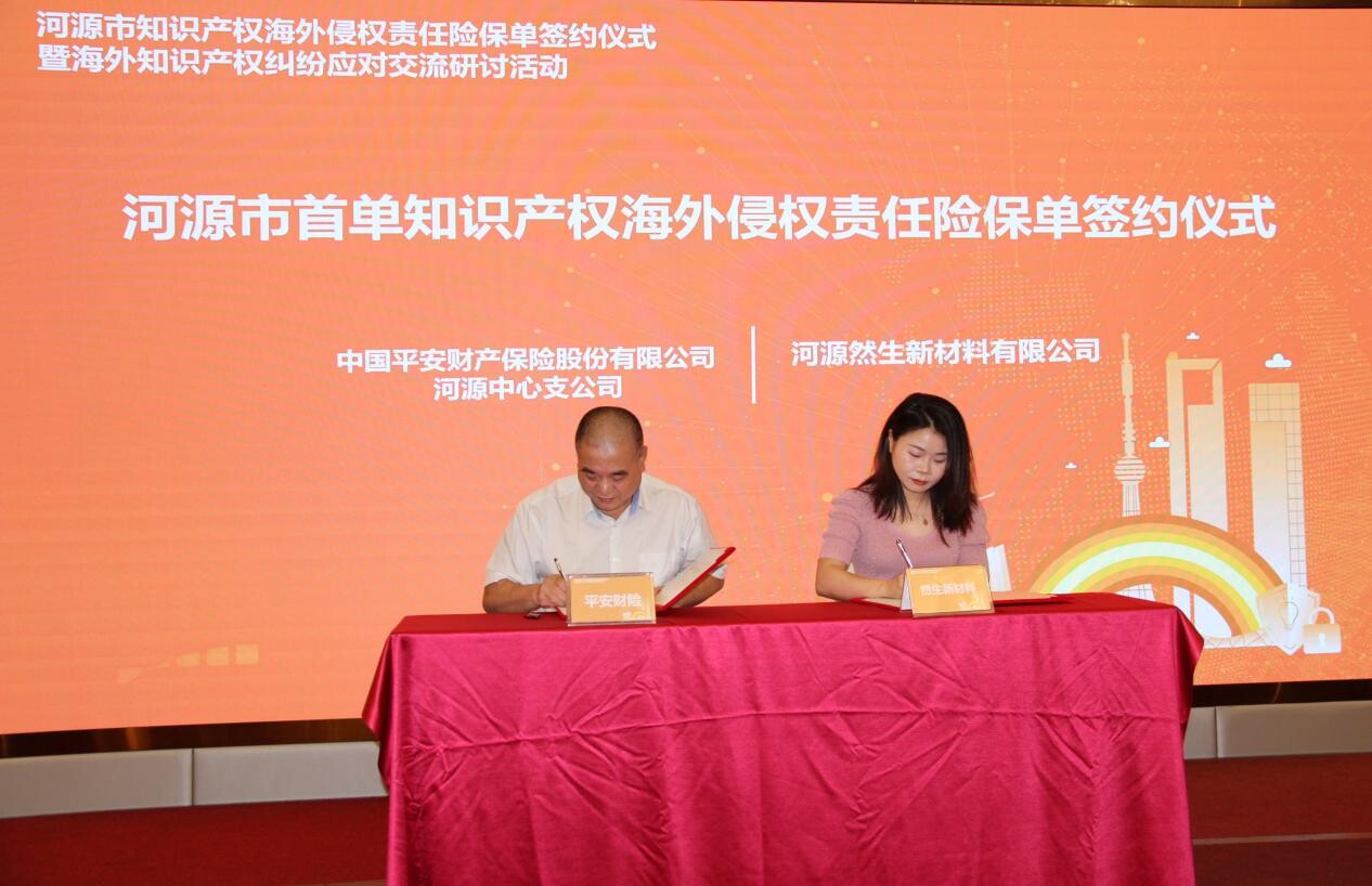 活动现场,河源然生新材料有限公司与中国平安财产保险股份有限公司河源中心支公司签订知识产权海外侵权责任保险合同,标志着河源市首单知识产权海外侵权责任保险正式落地,实现了该险种在我市从零到一的突破,体现了我市积极探索搭建政府引导、知识产权服务机构与保险机构合作、企业深度参与的新模式,让更多企业借助知识产权保险这一新利器,进一步增强产品出海的信心和底气,有效降低海外高额的知识产权维权成本。